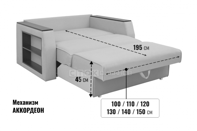 Диван Таункомпактный диван-кровать раскладной вперед. Надежный и простой механизм трансформации - аккордеон. Ящик для белья. Встроенные полочки в подлокотнике. Декоративные накладки на подлокотниках