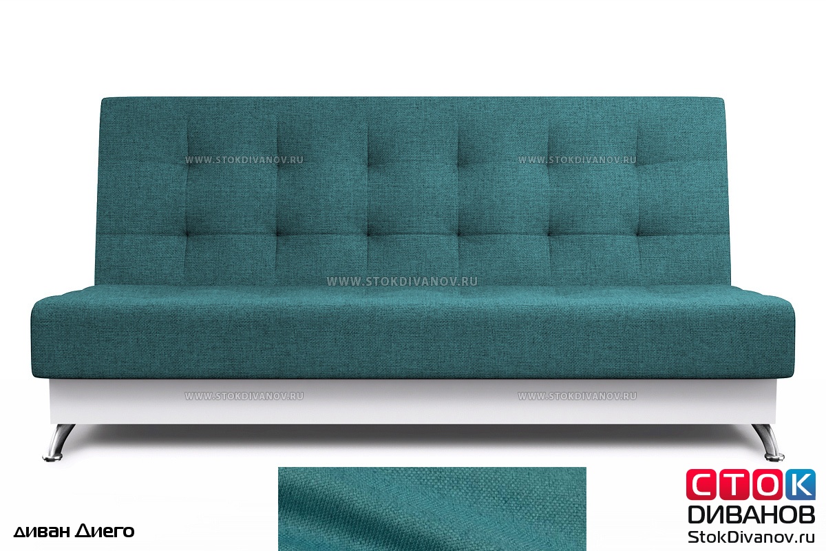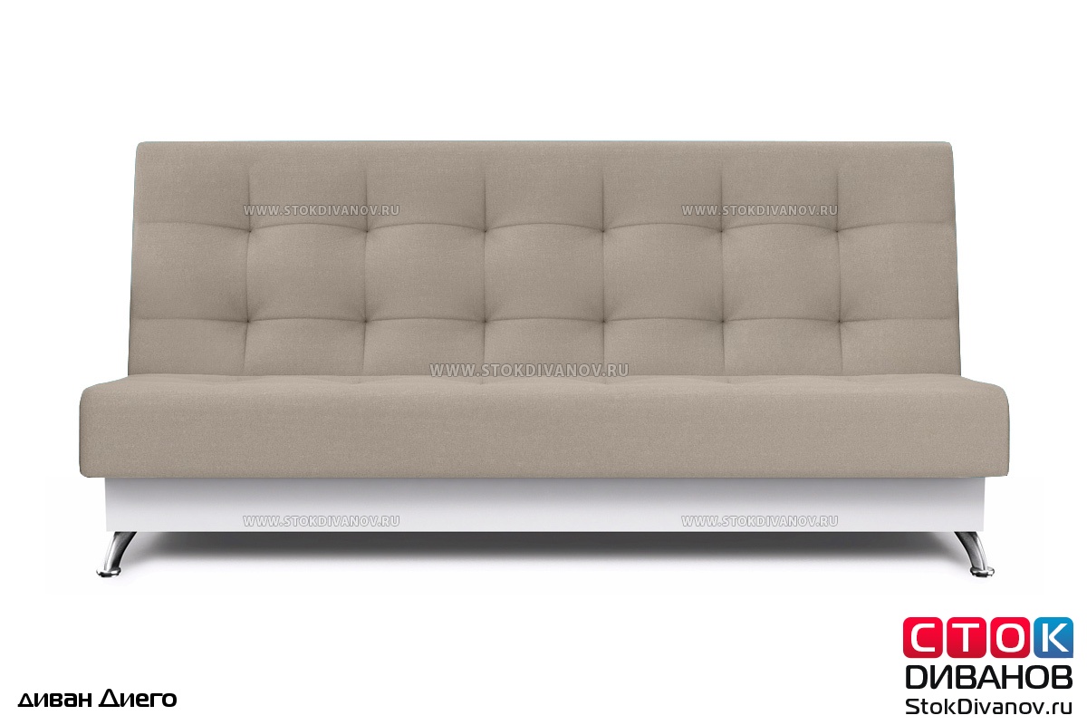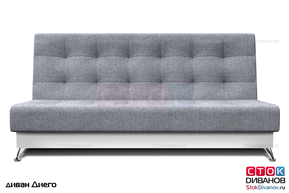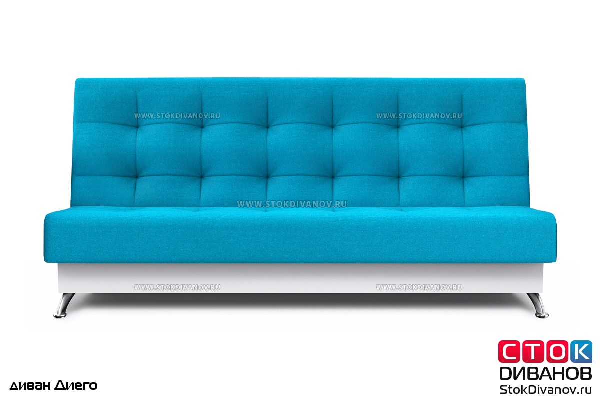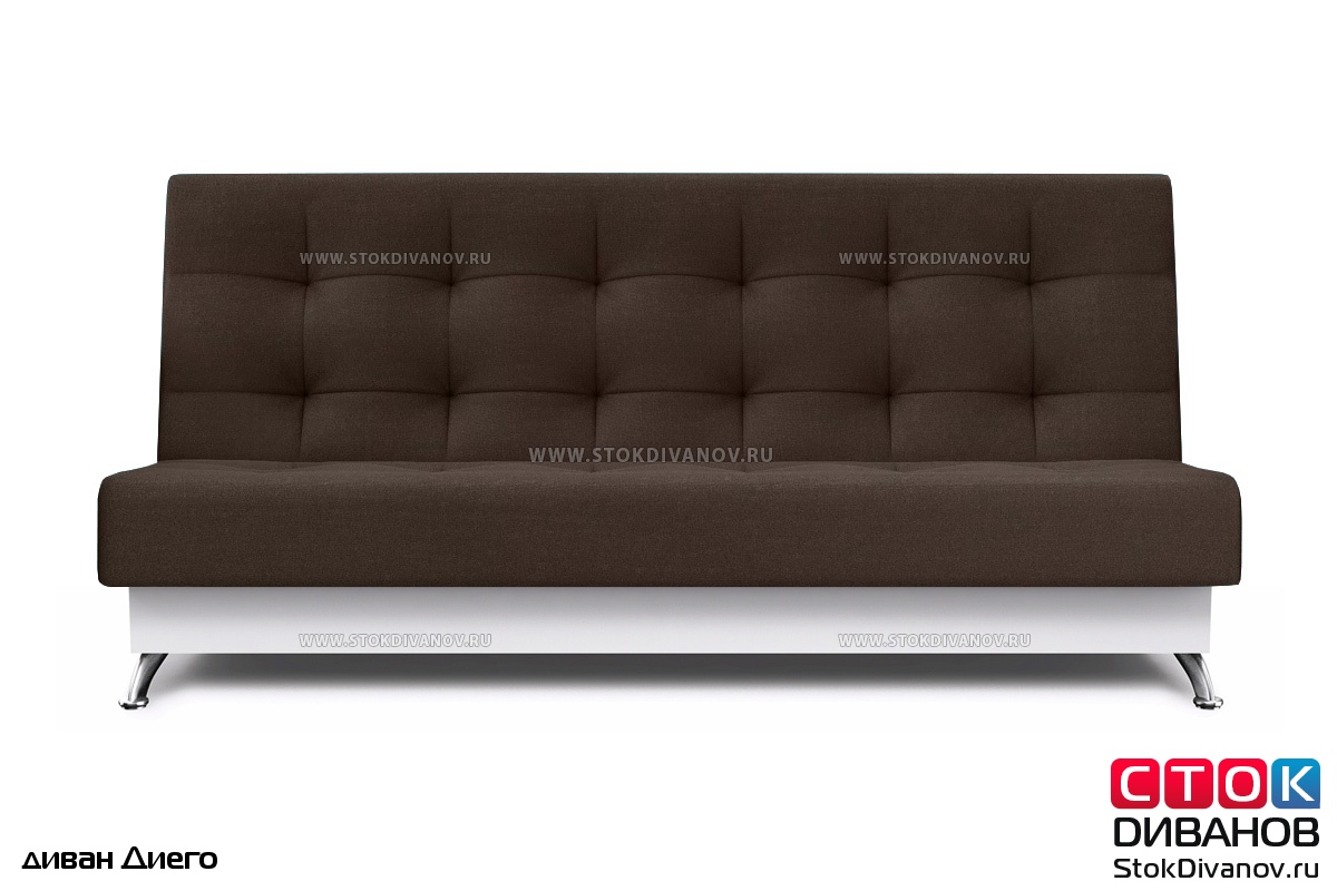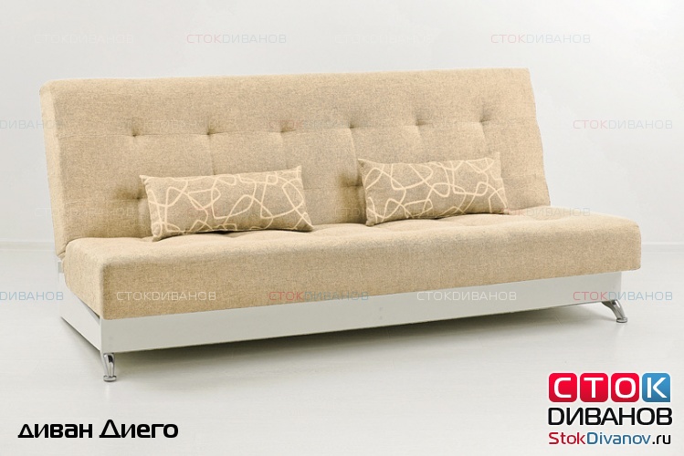 Диван Диегокомпактный диван без подлокотников. Раскладывается в кровать при помощи надежного механизма Книжка. Высокие ножки позволяют делать уборку под диваном. Ящик для белья под спальным местом - выполняется из ЛДСП. Утяжки по всей поверхности спального места. В основе дивана используется пружинный блок