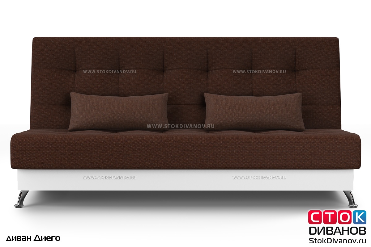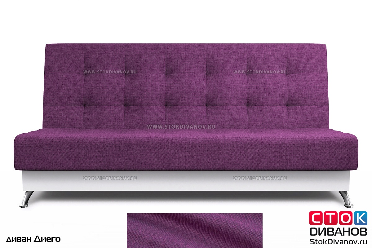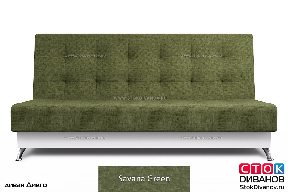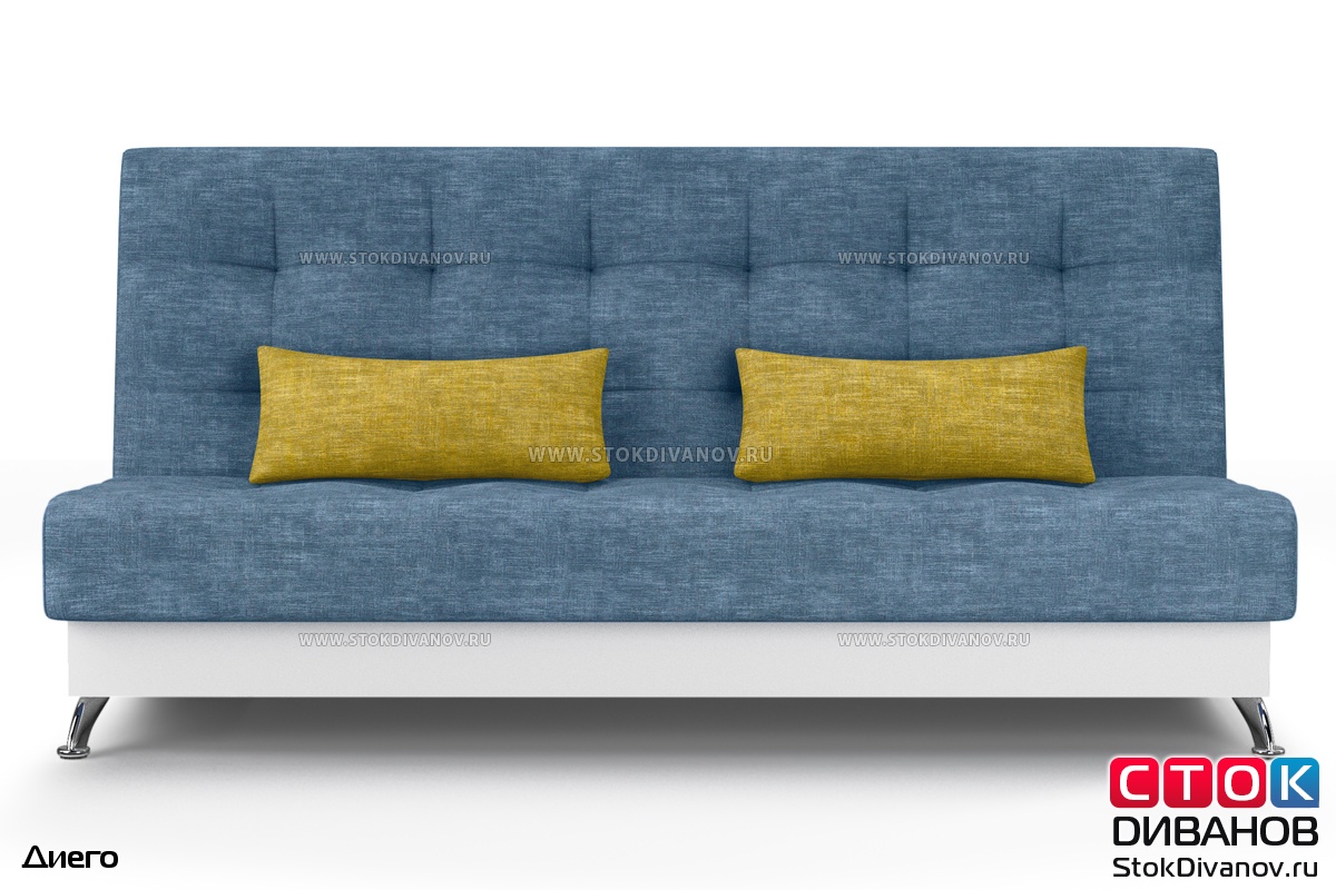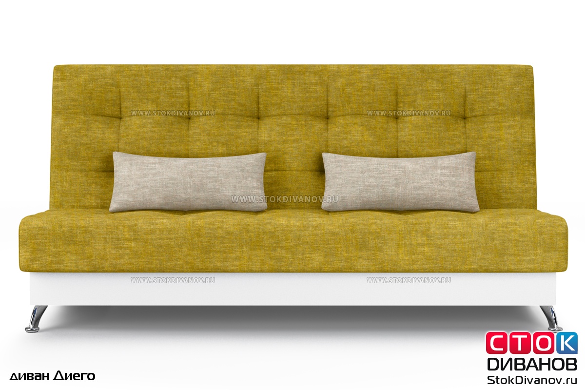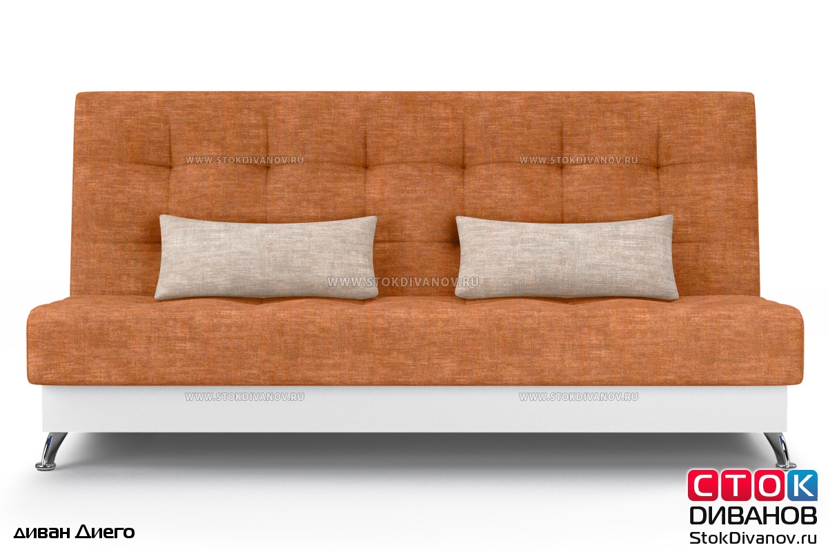 Диван Диегокомпактный диван без подлокотников. Раскладывается в кровать при помощи надежного механизма Книжка. Высокие ножки позволяют делать уборку под диваном. Ящик для белья под спальным местом - выполняется из ЛДСП. Утяжки по всей поверхности спального места. В основе дивана используется пружинный блок