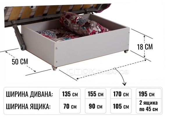 Небольшой ящик для белья позволяет хранить постельные принадлежности и другие вещи. Обратите внимание, у диванов с шириной спального места 180 см... ящик состоит из 2х отдельных секций.