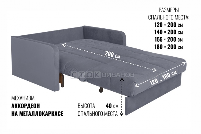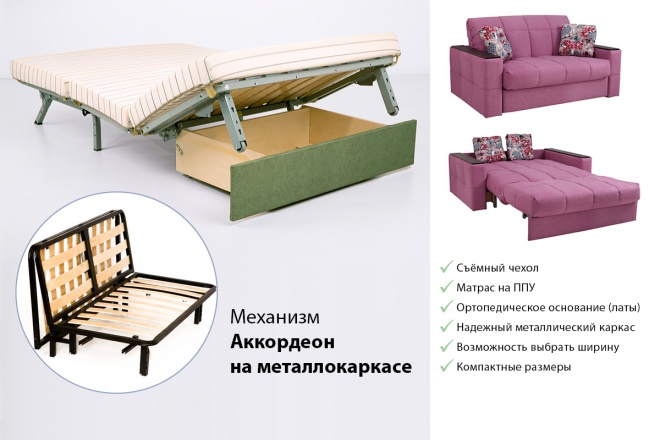 Диваны «Аккордеоны» на металлокаркасе легко раскладываются,... не занимают много места и отличаются просторным спальным местом с ортопедическим эффектом. Механизм относится к классу выдвижных (выкатных) диванов. Для раскладки дивана в кровать - потяните его на себя, и диван разложится вперед как гармошка. Диваны-аккордеоны на металлокаркасе являются компактными, габаритная ширина дивана от 120 см до 200 см. Такой диван можно ставить вплотную к стене.