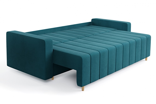 Сидение выдвигается вперед, открывая бельевой ящик, а спинка опускается на освободившееся... место. В связи с особенностью механизма подобный диван ставится на расстоянии 2-3 см. от стены. В разложенном виде такие диваны имеют достаточно большое и абсолютно ровное спальное место, высота которого соответствует кроватному.