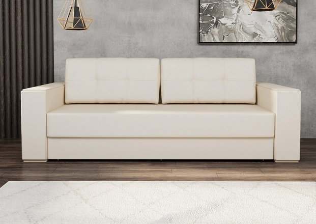 Сидение выдвигается вперед, открывая бельевой ящик, а спинка опускается на освободившееся... место. В связи с особенностью механизма подобный диван ставится на расстоянии 2-3 см. от стены. В разложенном виде такие диваны имеют достаточно большое и абсолютно ровное спальное место, высота которого соответствует кроватному.
