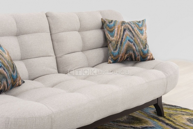 Такой механизм надежен и долговечен. Простота раскладывания, металлический каркас, ортопедическое основание на латах, наличие бельевого ящика - это, несомненно,... выигрышные стороны механизма «клик-кляк». Диваны на основе этого механизма необходимо ставить на небольшом расстоянии от стены, порядка 20 см - это необходимо для раскладывания дивана.