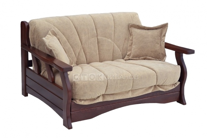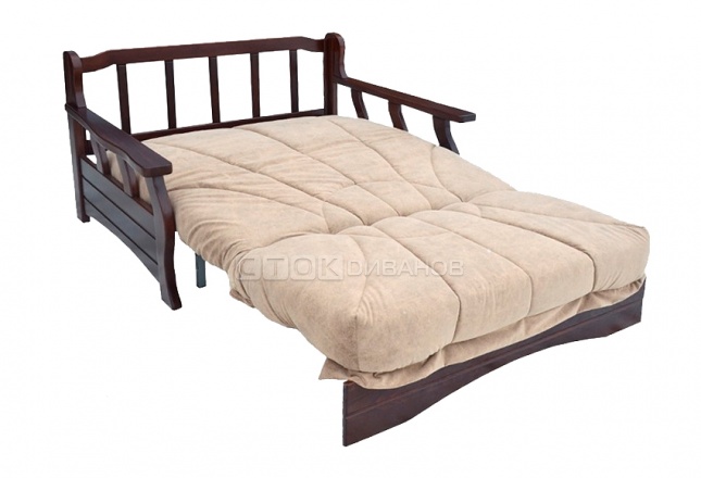 Диван Золото – раскладной диван на металлокаркасе с надежным механизмом аккордеон. Подлокотники выполнены из натурального дерева, окрашенные в темный цвет