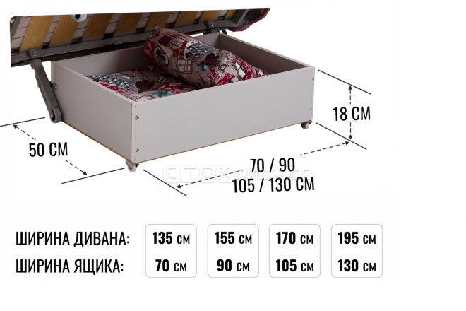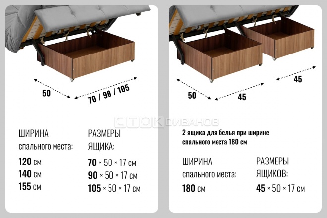 Для спального места шириной 140 см размеры бельевого ящика - 97 х 52 х 18 см