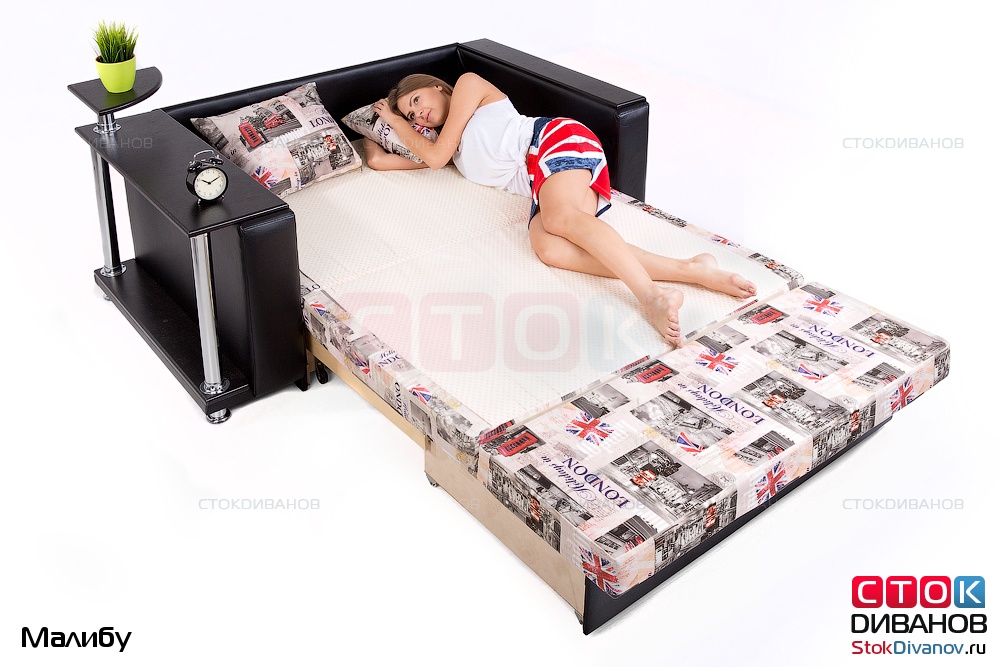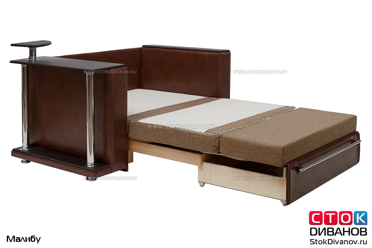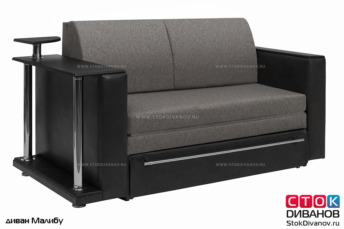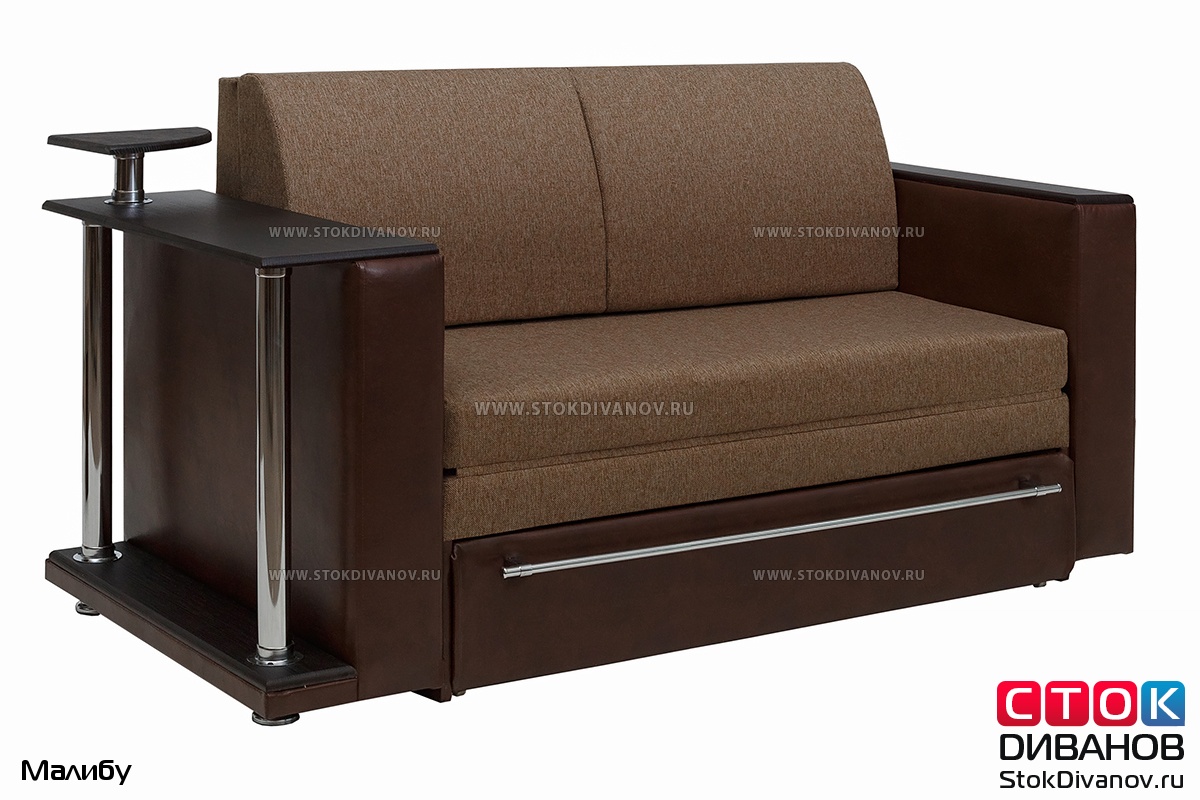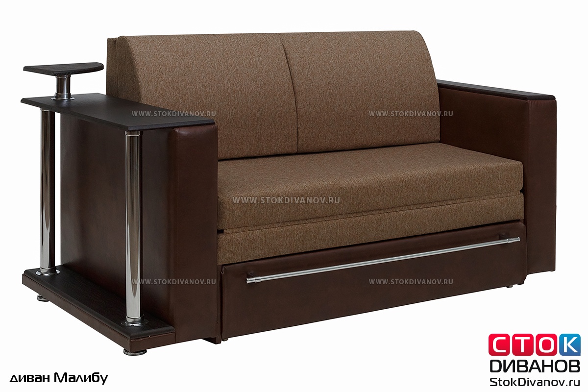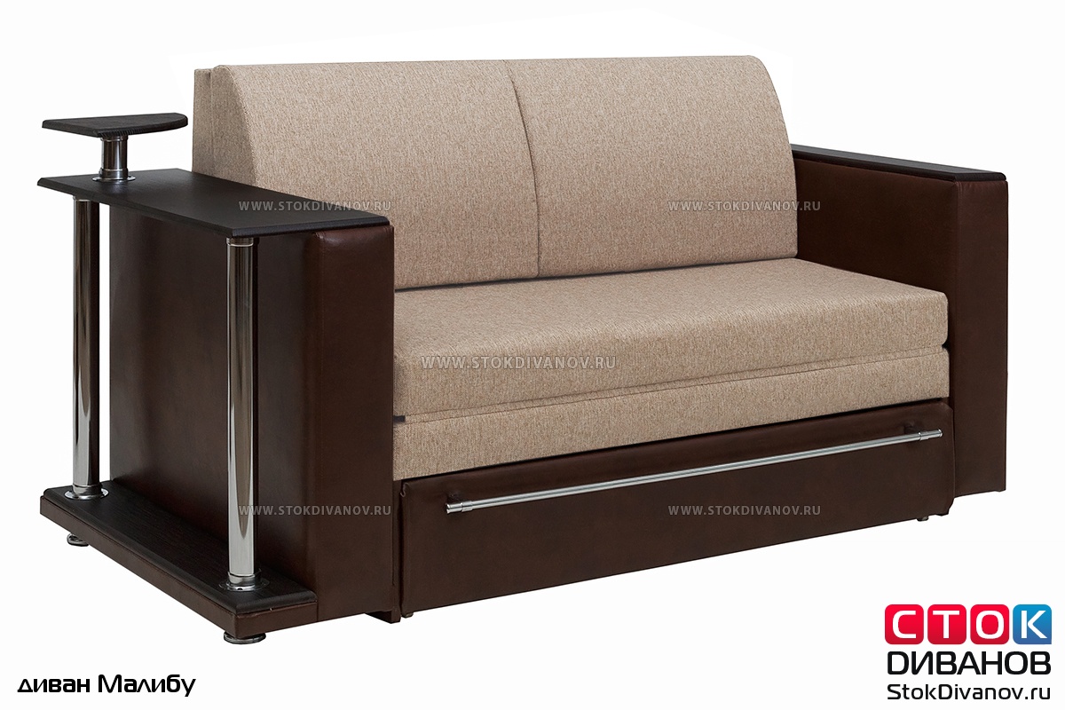 Диван Малибураскладной диван-кровать с удобным столиком. Выкатной механизм - простой и надежный, раскладывается вперед, не царапает пол. Цвет полочек - темный. В диване есть небольшой ящик для белья.