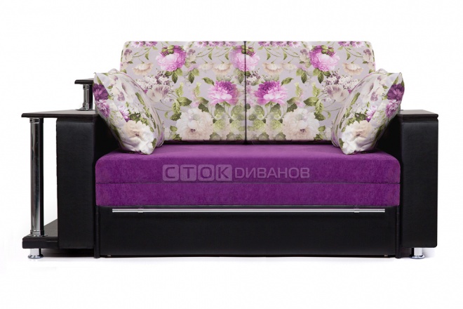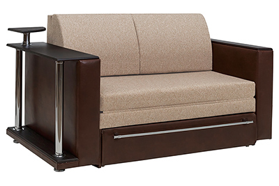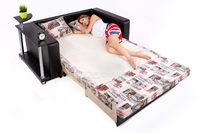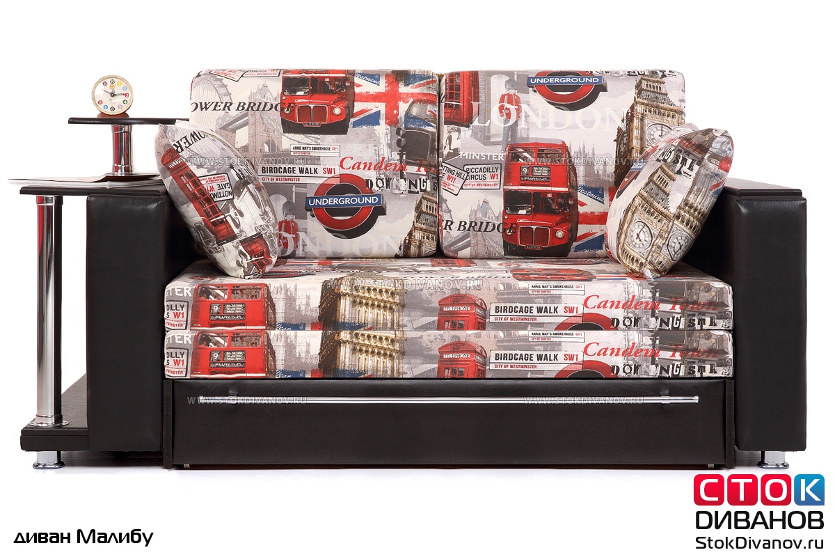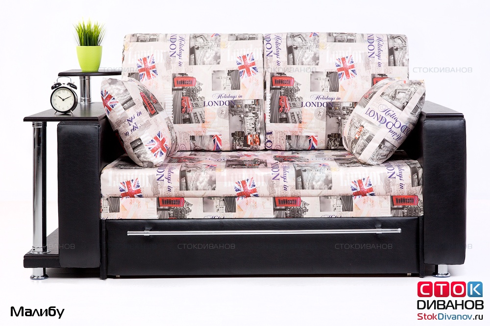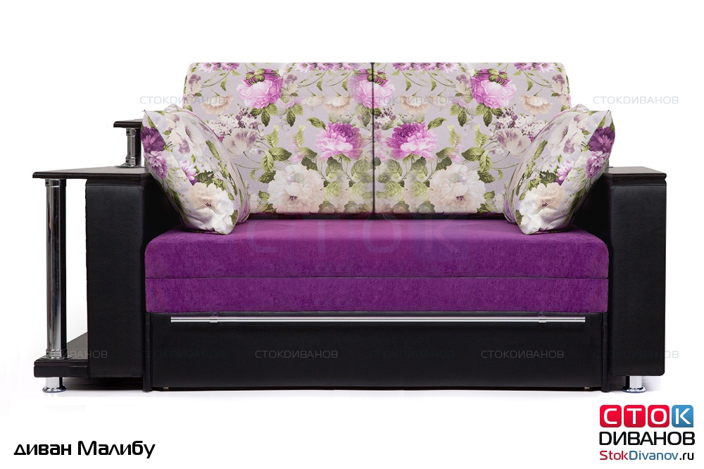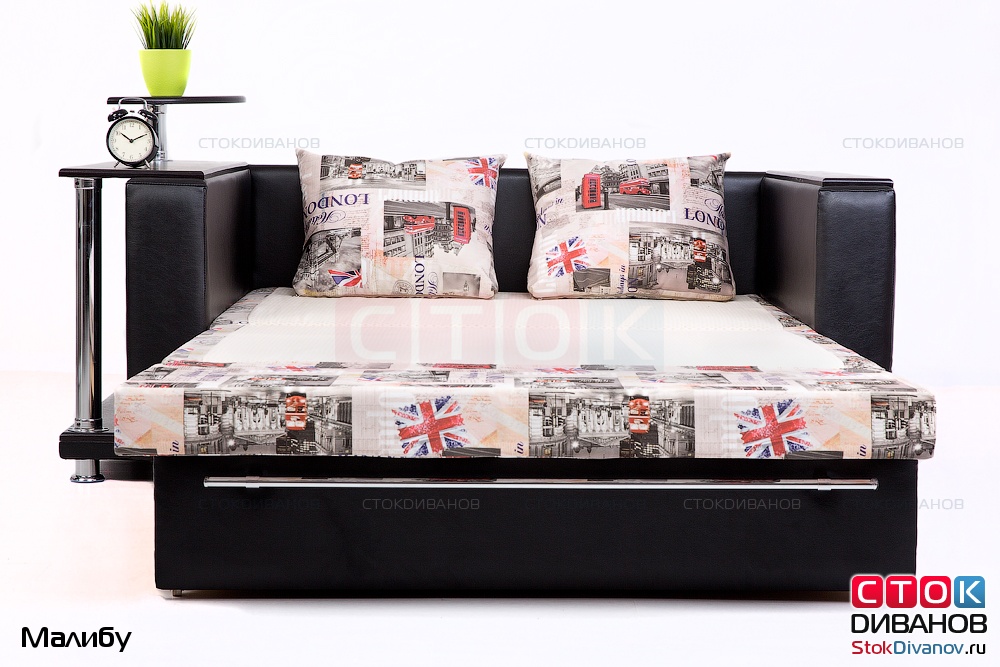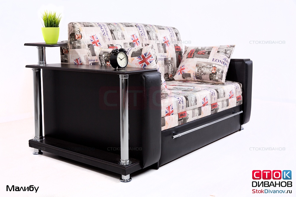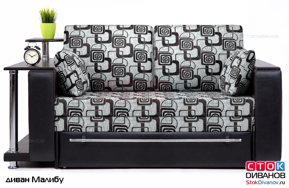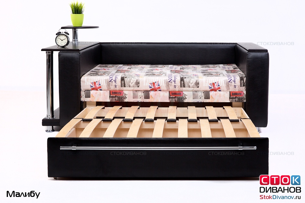 Диван Малибураскладной диван-кровать с удобным столиком. Выкатной механизм - простой и надежный, раскладывается вперед, не царапает пол. Цвет полочек - темный. В диване есть небольшой ящик для белья.