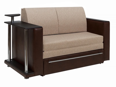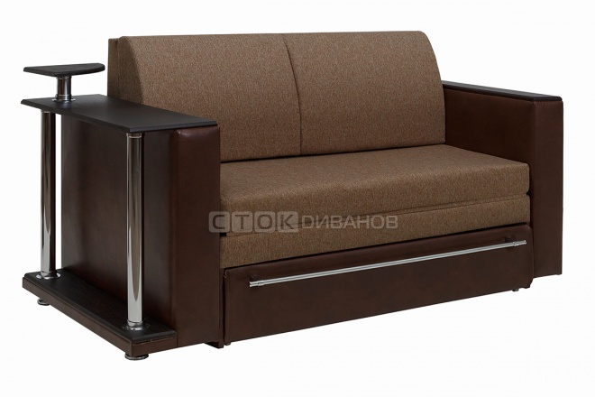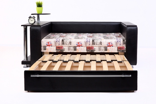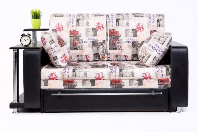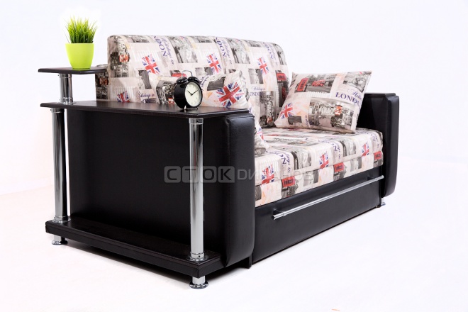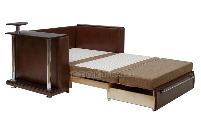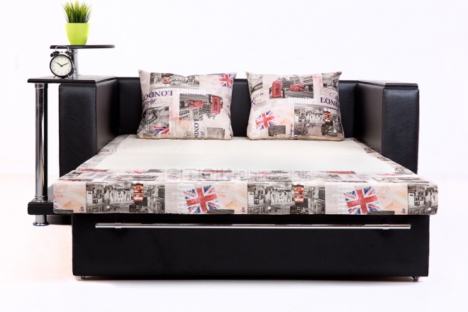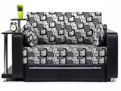 Компактный и современный диван с удобным столиком. Ширину спального места можно выбрать по своему усмотрению. Основание дивана с ортопедическим эффектом за счет деревянных лат. Под спальным местом просторный ящик для белья.