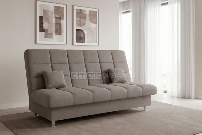Диван Модернкомпактный диван без подлокотников. Раскладывается в кровать при помощи надежного механизма Книжка (клик-кляк). В основе дивана используется металлокаркас с ортопедическим основанием на латах. Ящик для белья под спальным местом. Утяжки по всей поверхности спального места. Наполнение спального места - ППУ (пенополиуретан) средней жесткости. Небольшие металлические ножки обеспечивают доступ к пространству под диваном во время уборки.