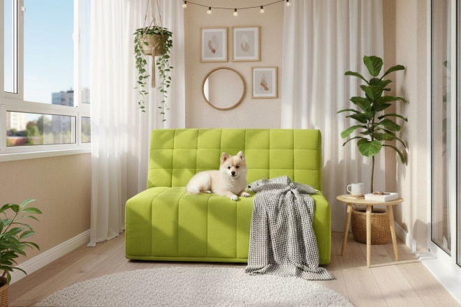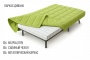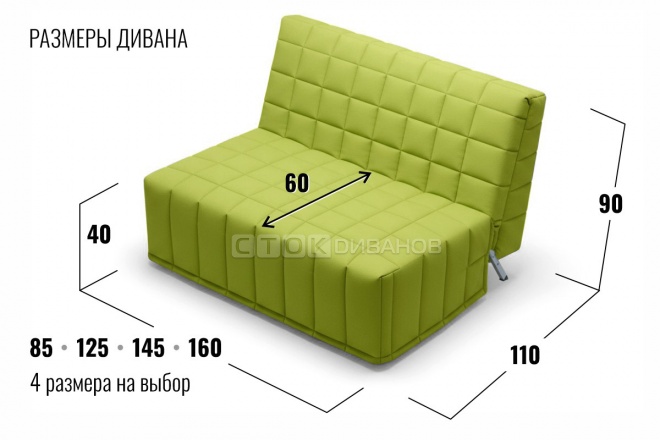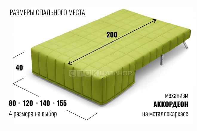 Диван Лаймкомпактный диван-кровать без подлокотников. Диван раскладывается вперед за счет механизма «аккордеон» на металлокаркасе. Простой и надежный механизм трансформации, легко раскладывается, не царапает пол. Ортопедическое основание на латах, матрас на основе пенополиуретана (ППУ). Толщина матраса - 10 см, средняя жёсткость.