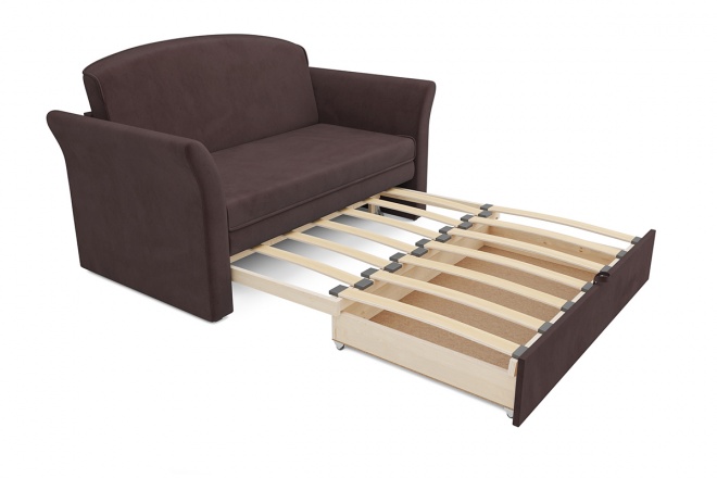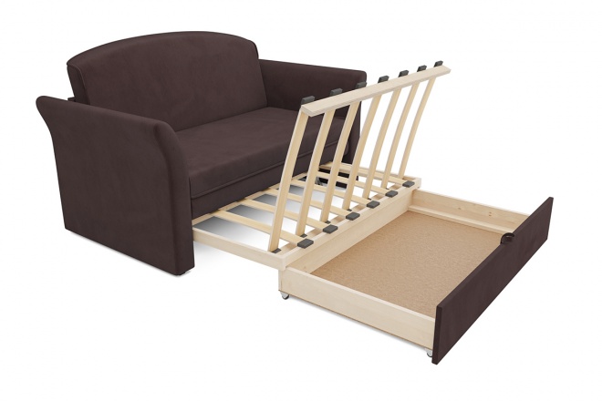 Диван Линдакомпактный диван-кровать с красивыми плавными формами. Диван раскладывается в кровать при помощи выкатного механизма. Ровная поверхность для сна. В качестве основания используются березовые ламели. Матрац - высокоэластичный ППУ (мебельный поролон). Основание на деревянных латах равномерно распределяет нагрузку на спальное место. Для хранения подушек и постельных вещей предусмотрен ящик для белья.