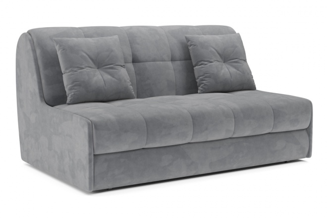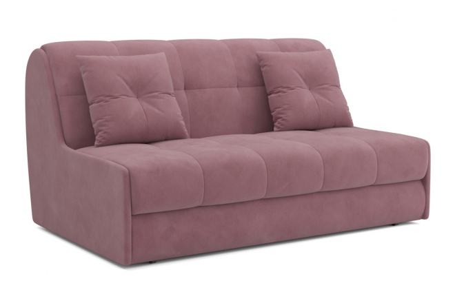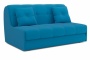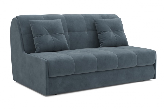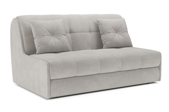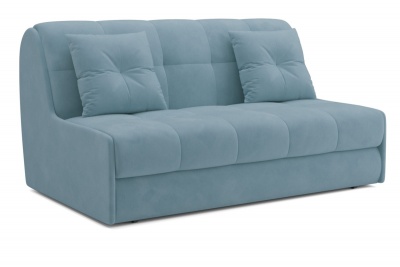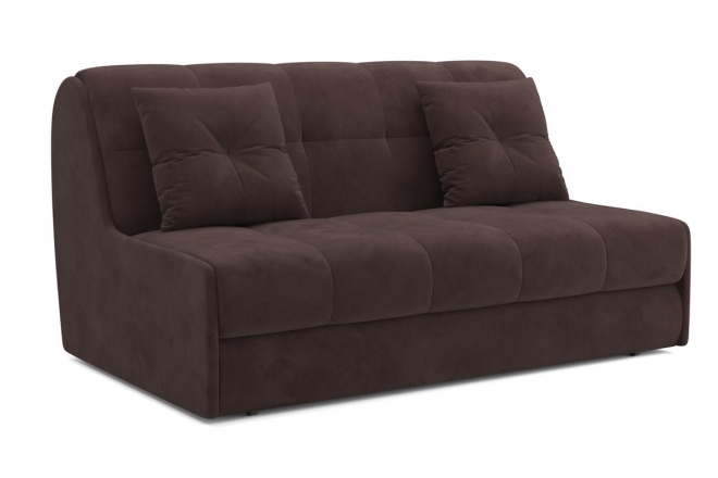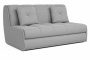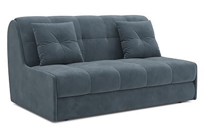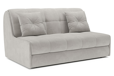 компактный диван-кровать с высокой спинкой. Спинка выполнена из ткани. В разложенном виде диван приобретает вид интерьерной кровати с мягким изголовьем.