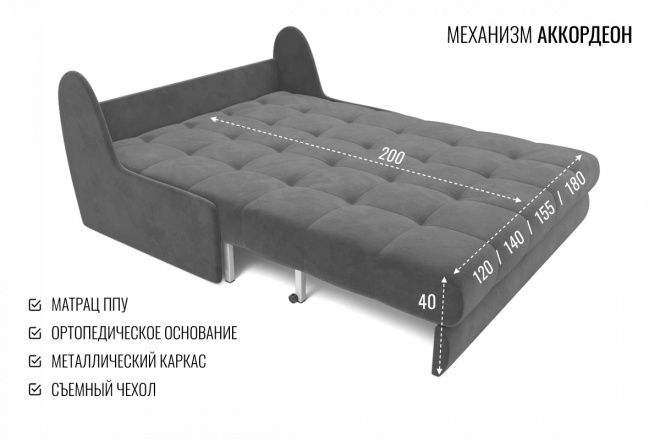 Диван Мичиган-2компактный диван-кровать раскладной вперед. Надежный и простой механизм трансформации - аккордеон на металлокаркасе. Надежный механизм трансформации, легко раскладывается, не царапает пол. Узкие подлокотники с плавными формами. Съемный чехол