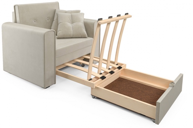Кресло-кровать Вендикомпактное кресло-кровать со спальным местом. Простой и надежный механизм - Выкатной вперед. Ящик для белья. Матрац на основе ППУ. Основание спального места - латы. Подлокотники и спальное место с декоративным кантом из ткани