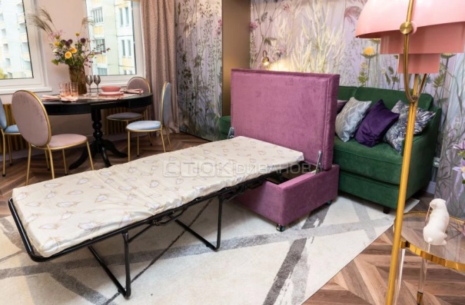 Разновидность работает по принципу разворачивания свитка. Матрас из поролона и раскладушка помещены внутри сиденья. Когда Вы тянете за петлю, спрятанную... в нем, диван раскладывается. Механизм трансформации здесь позволяет производителям не ограничивать себя в дизайнерских изысках, соответственно, модели получаются более оригинальные и представительные по внешнему виду. Этот вариант дивана рекомендуется для гостиных. "Французская раскладушка" разворачивается в три этапа при снятых подушках сидения. Спать на таких диванах удобно. Поролоновый матрас. К особенностям механизма относятся отсутствие ящика для белья и необходимость смазки касающихся деталей механизма каждые 2-3 месяца (иначе возникает скрип). Диван с таким механизмом можно поставить вплотную к стене.