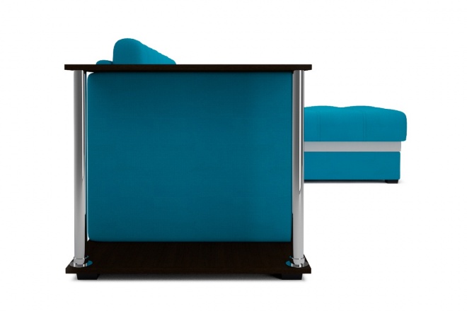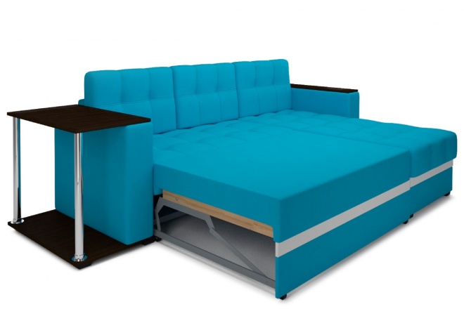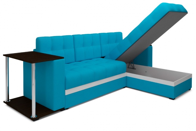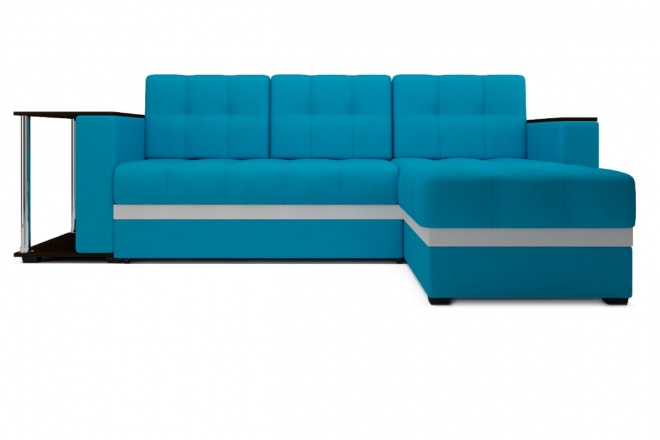 Угловой диван Атлантугловой диван с верхними накладками и встроенным столиком в одном из подлокотников. В разложенном виде диван имеет просторное спальное место как у полноценной двуспальной кровати. Механизм трансформации - дельфин. Наполнение в базовой комплектации - ППУ матрац. Ящик для белья из ЛДСП