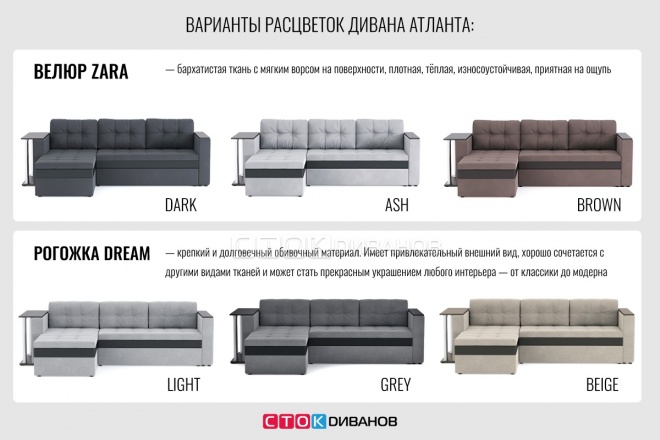 Угловой диван Атланта выпускается только в 6 вариантах расцветок. Если вам необходима другая расцветка - посмотрите похожие модели, которые можно заказать в других цветах