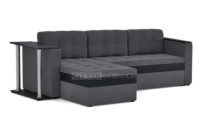 Угловой диван Атлантадиван со столиком в подлокотнике. Механизм трансформации дельфин. Наполнение спального места - высокоэластичный ППУ средней жесткости. Ящик для белья находится в оттоманке, выполнен из ДСП. Чехлы подушек несъемные, наполнение - крошка ППУ. Задняя спинка в технической ткани (можно сделать в ткани дивана - дополнительная опция). Спальное место полностью в основной ткани.