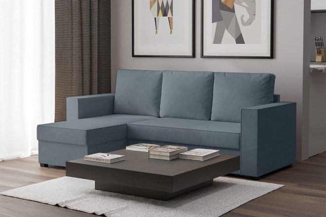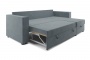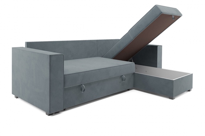 Угловой диван Давидчеткие прямоугольные формы со сглаженными углами, широкое сиденье и прямые подлокотники. Механизм трансформации - дельфин. Ящик для белья из ЛДСП в угловой части. Универсальный угол - левый или правый. Наполнитель спального места - пенополиуретан (ППУ).