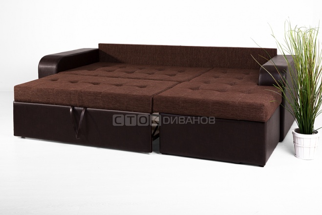 Угловой диван Атикопросторный угловой диван-кровать. Простой и надежный механизм Дельфин. Ящик для белья, декоративная утяжка на спальном месте и подушках. ППУ матрац