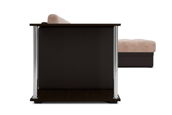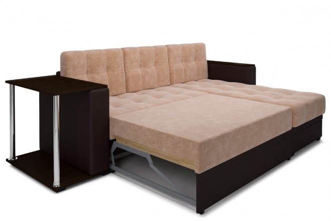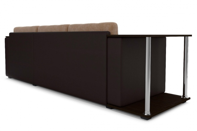 Угловой диван Атлантугловой диван с верхними накладками и встроенным столиком в одном из подлокотников. В разложенном виде диван имеет просторное спальное место как у полноценной двуспальной кровати. Механизм трансформации - дельфин. Наполнение в базовой комплектации - ППУ матрац. Ящик для белья из ЛДСП