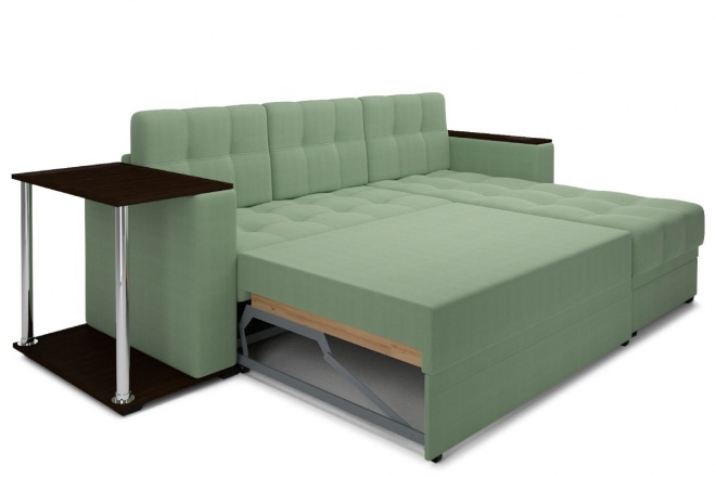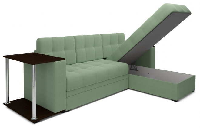 Угловой диван Атлантугловой диван с верхними накладками и встроенным столиком в одном из подлокотников. В разложенном виде диван имеет просторное спальное место как у полноценной двуспальной кровати. Механизм трансформации - дельфин. Наполнение в базовой комплектации - ППУ матрац. Ящик для белья из ЛДСП