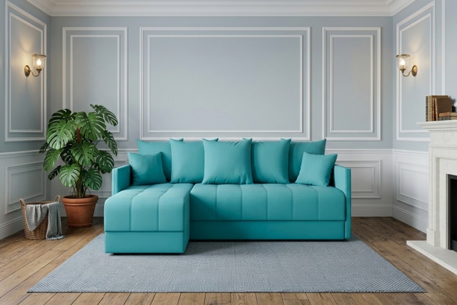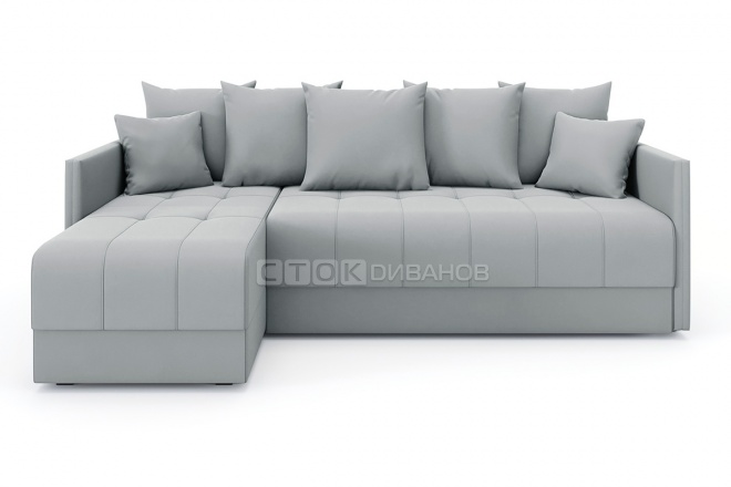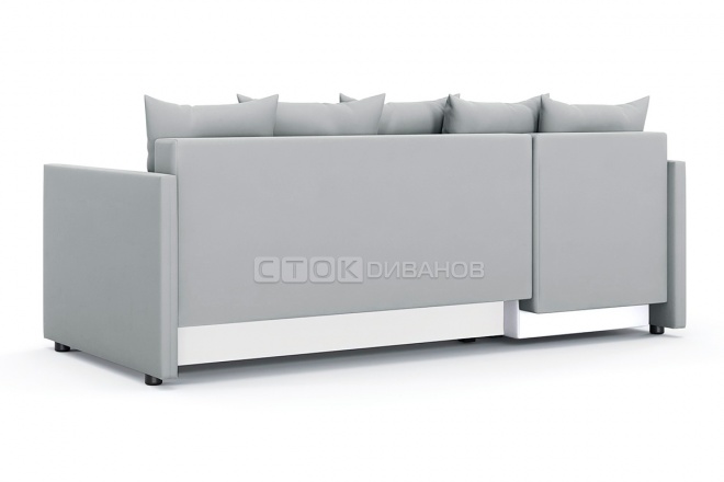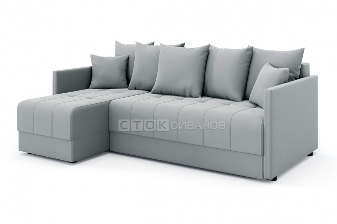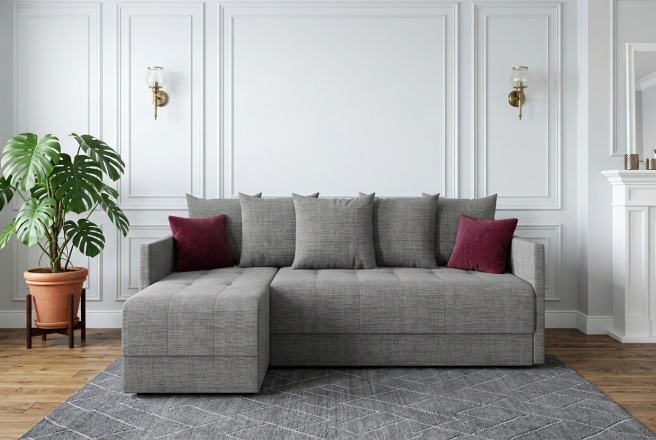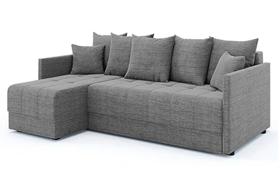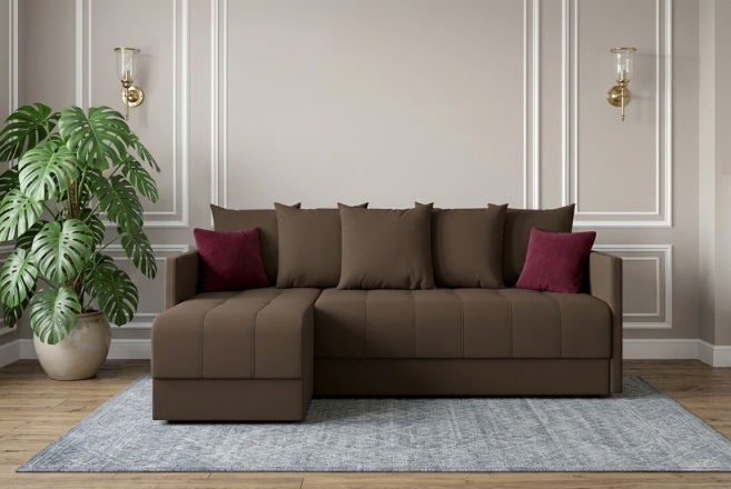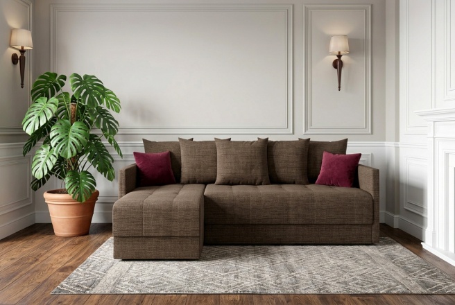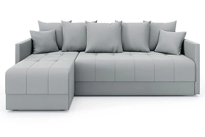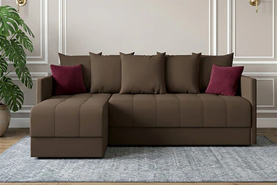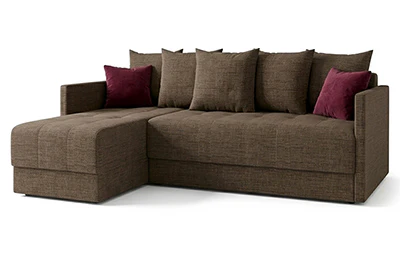Угловой диван Борнео – суперкомпактный угловой диван с узкими подлокотниками. Механизм трансформации еврокнижка. Глубина со стороны подлокотника - 94см. Глубина со стороны оттоманки - 136см. Высота спинки - 74см. Высота дивана с подушками - 90см. Ящик для белья-есть, под сиденьем. Чехлы подушек-несъемные, наполнение крошка ППУ. В комплекте 5 больших подушек 50*50см и 2 маленьких-35*35см. Маленькие подушки выполняются в расцветке дивана (по умолчанию). Расцветку дивана можно сделать любую - по каталогу тканей.