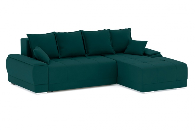 Механизм трансформации Еврокнижка. Наполнение спального места - высокоэластичный ППУ средней жесткости (по умолчанию). Ящик для белья расположен в центральной части дивана. Оттоманка не открывается (по умолчанию). Чехлы подушек-несъемные, наполнение крошка ППУ. Декоративные металлические ножки.