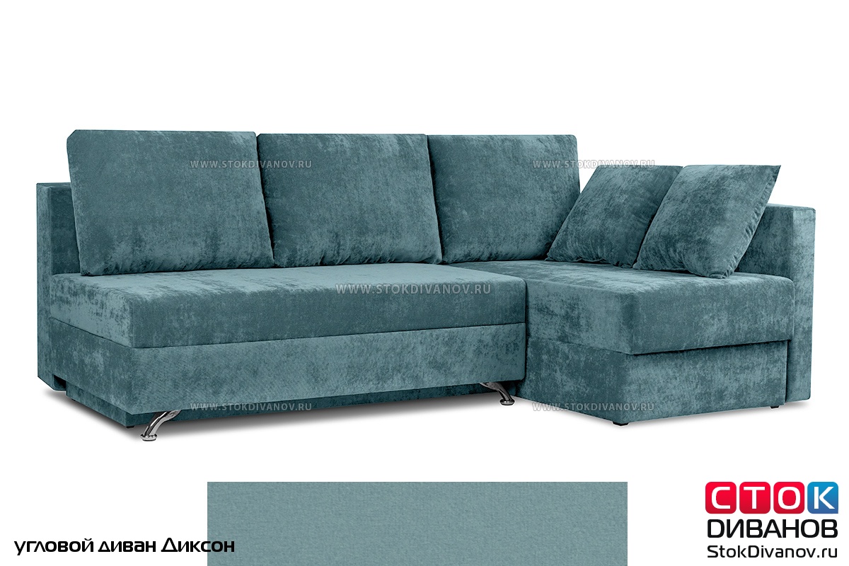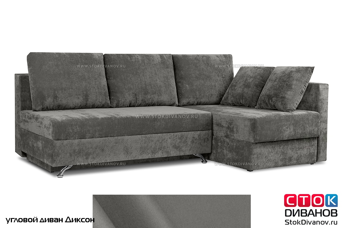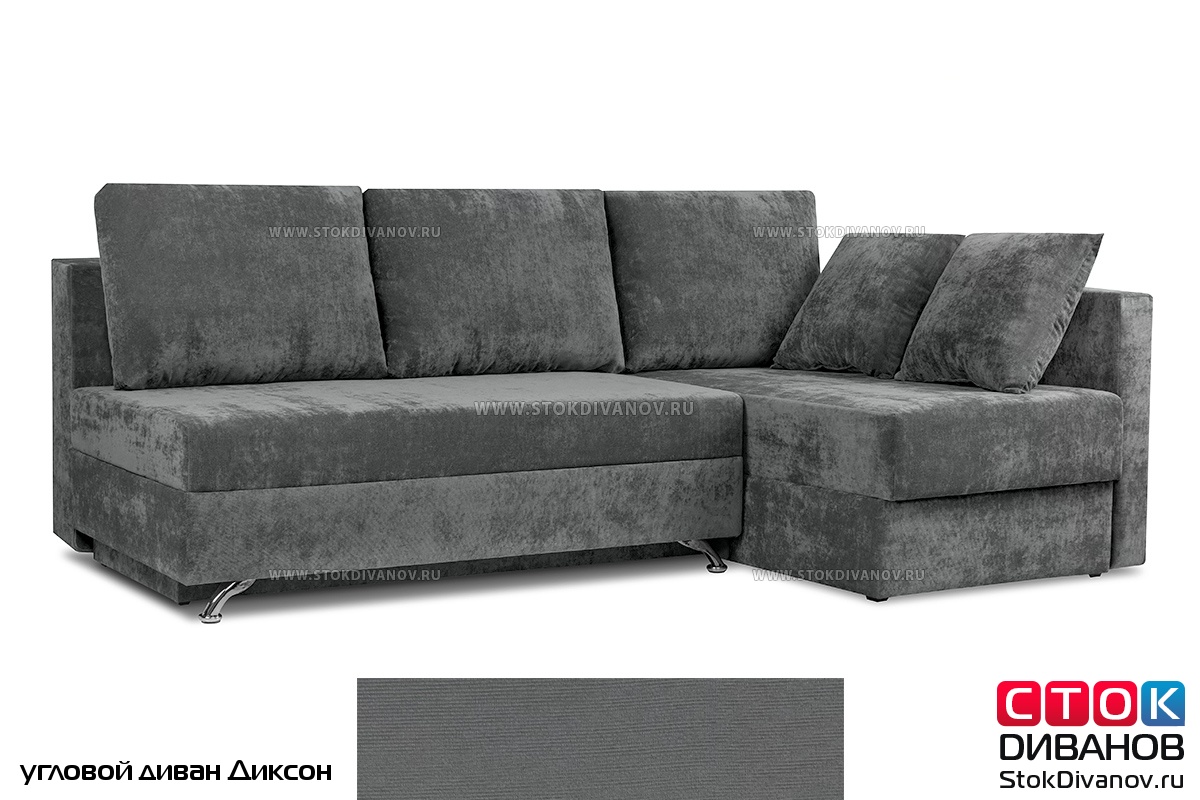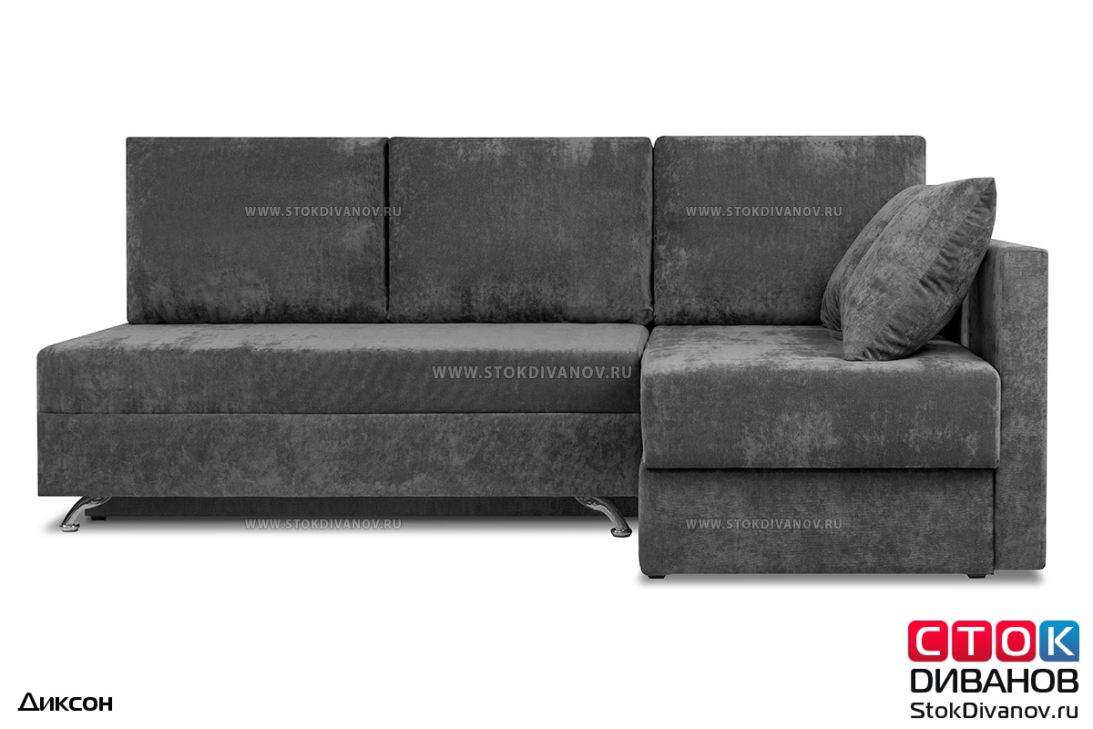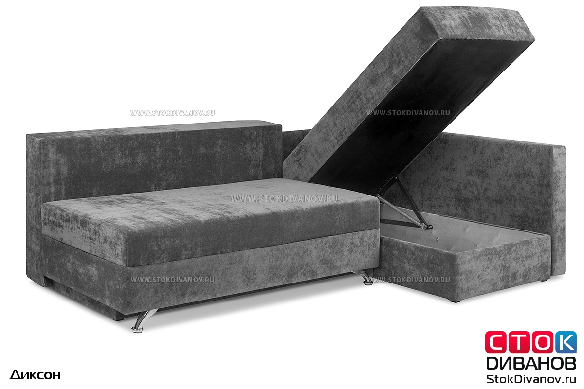 Угловой диван Диксон – компактный угловой диван со спальным местом. Простой и надежный механизм трансформации - Еврокнижка. Один длинный подлокотник по длине всего спального места. В основе дивана используется пружинный блок (зависимый). Ящик для белья.