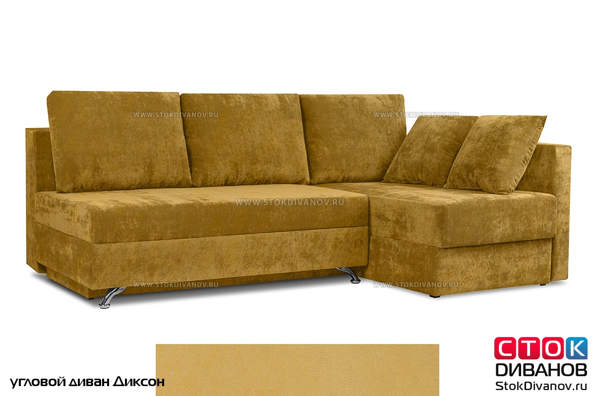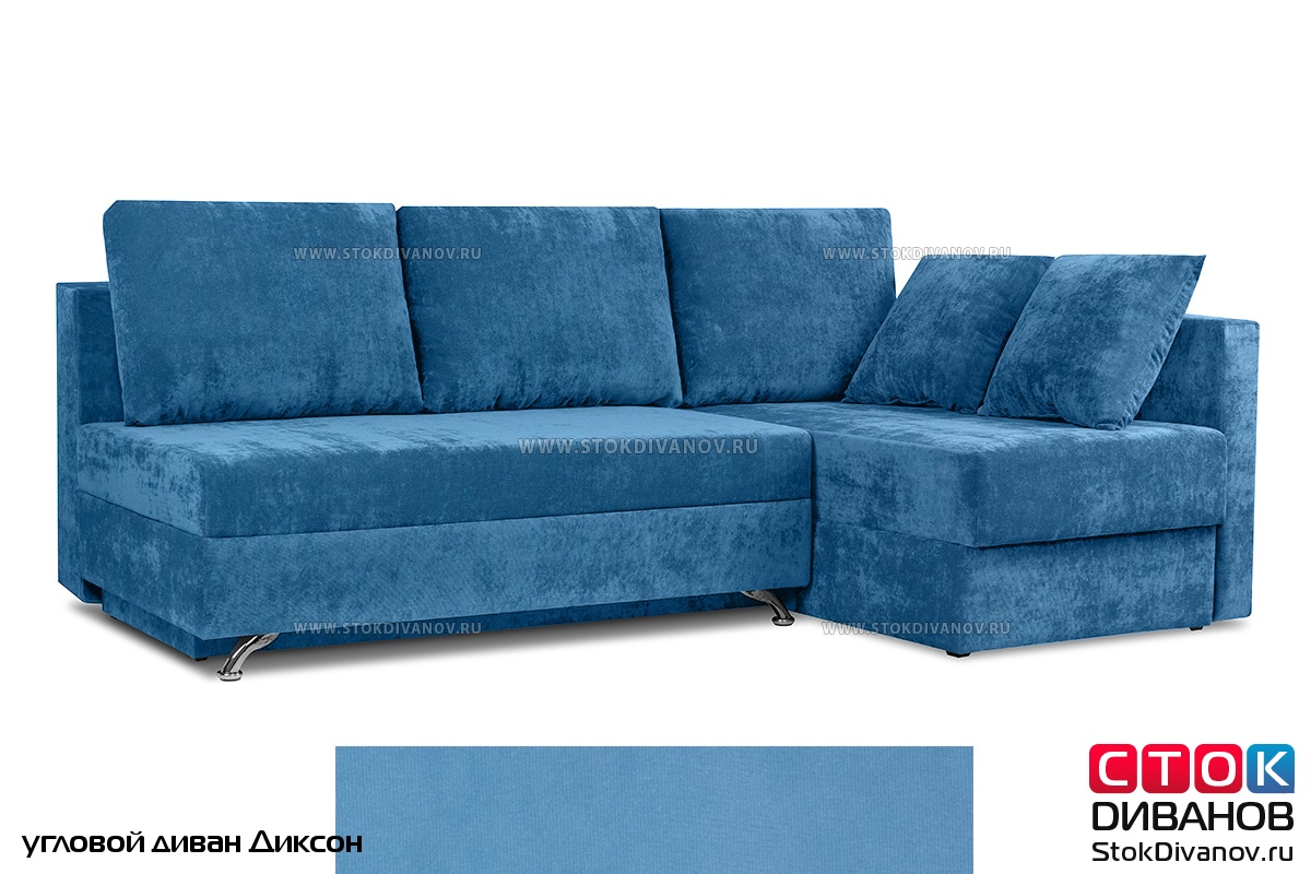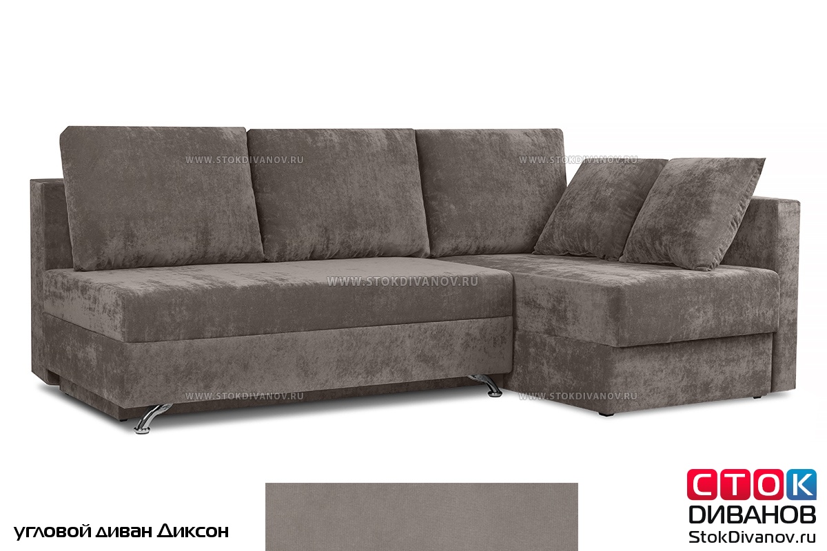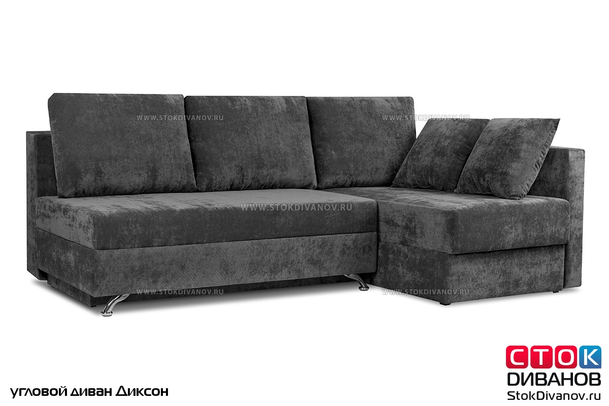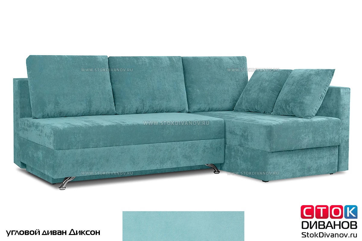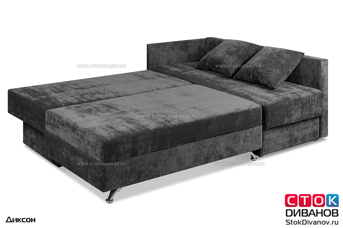Угловой диван Диксон – компактный угловой диван со спальным местом. Простой и надежный механизм трансформации - Еврокнижка. Один длинный подлокотник по длине всего спального места. В основе дивана используется пружинный блок (зависимый). Ящик для белья.