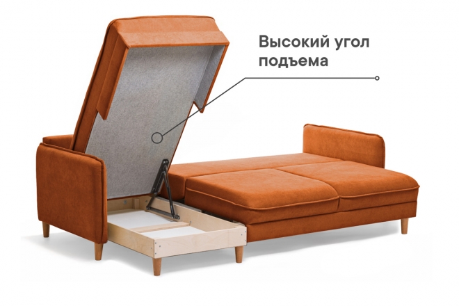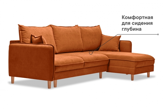 Особенностью дивана является лаконичный внешний вид в скандинавском стиле. Наличие высоких деревянных ножек позволяет делать уборку под диваном при помощи робота-пылесоса.